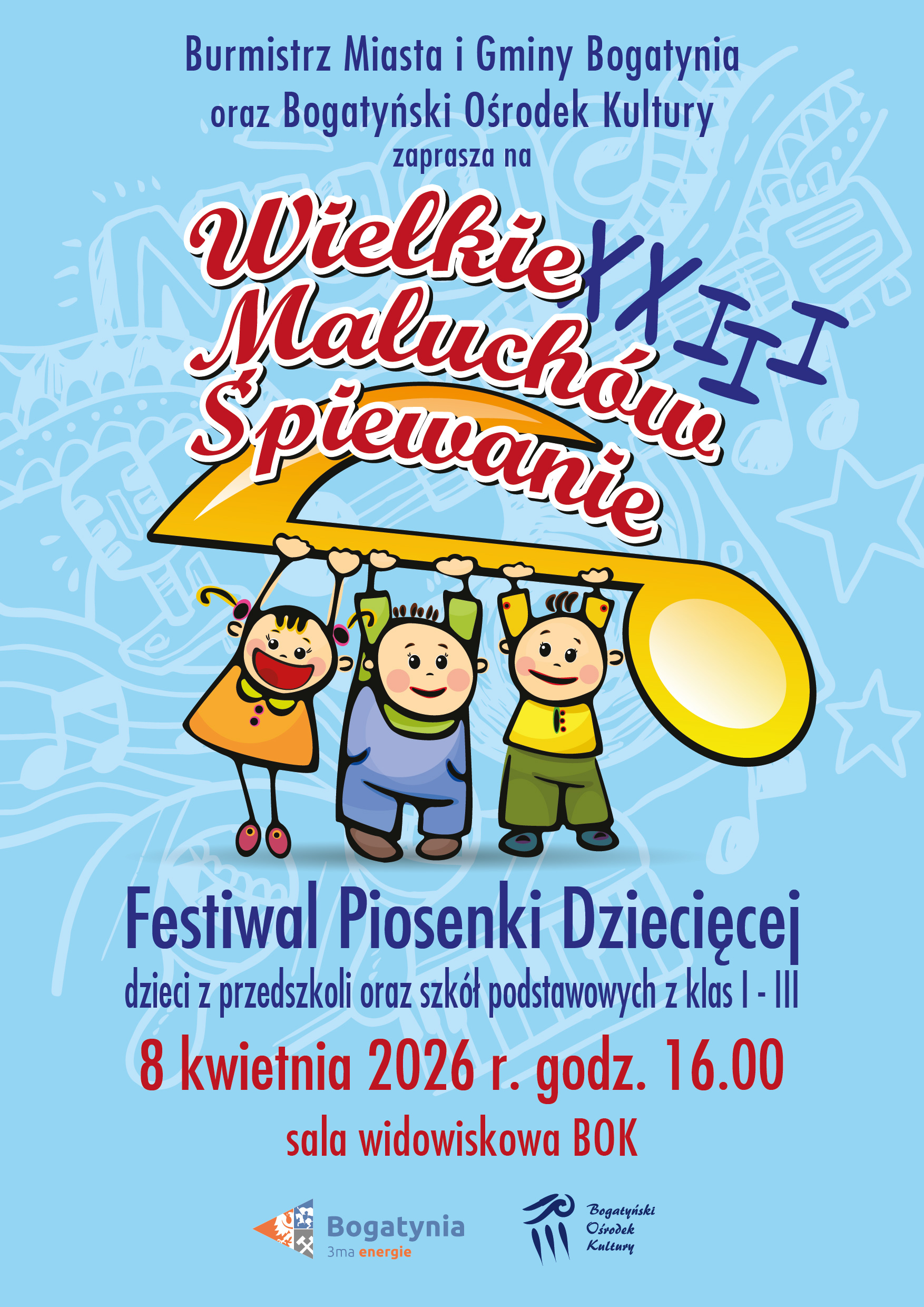 Burmistrz Miasta i Gminy Bogatynia oraz Bogatyński Ośrodek Kultury zapraszają na XXIII Festiwal Piosenki Dziecięcej „Wielkie Maluchów Śpiewanie"