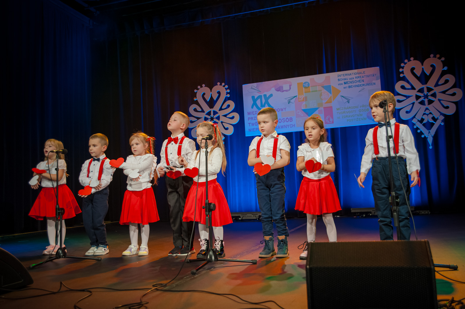 W Przeglądzie jak co roku udział wzięły osoby z niepełnosprawnościami z domów opieki, ośrodków pomocy społecznej, szkół z oddziałami integracyjnymi i pracowni artystycznych oraz osoby niezrzeszone. Dyrektor BOK Marcin Woroniecki wraz z Eweliną Gabarą-Walczak serdecznie powitał wszystkich zgromadzonych, przedstawił program imprezy i zaprosił na scenę patrona honorowego imprezy Burmistrza Miasta i Gminy Bogatynia Wojciecha Dobrołowicza, który z niewielką pomocą młodego widza oficjalnie otworzył przegląd. Obejrzeliśmy 13 występów artystycznych: przedstawienia teatralne, prezentacje taneczne, prezentacje wokalne, instrumentalne i wokalno-instrumentalne solistów i zespołów. Gościnnie wystąpiła dziecięca grupa taneczno-wokalna „Turoszowianie” ze Szkoły Podstawowej nr 1 w Bogatyni. Z rąk Burmistrza wszyscy uczestnicy otrzymali medale, pamiątkowe dyplomy oraz upominki, natomiast placówki otrzymały paczki z materiałami do organizacji warsztatów integracyjnych i plastycznych. Po występach scenicznych wszyscy udali się na górny hol, przed galerię stopART, gdzie prezentowana była wystawa twórczości osób z niepełnosprawnościami. Wielki finał odbył się w sali tanecznej Bogatyńskiego Ośrodka Kultury gdzie na wszystkich czekał poczęstunek. Serdecznie dziękujemy za obecność na XIX Międzynarodowym Przeglądzie Twórczości Osób Niepełnosprawnych i zapraszamy na kolejny już za rok! Imprezę ze sceny poprowadził Dyrektor BOK Marcin Woroniecki i Ewelina Gabara-Walczak. Prace artystów można podziwiać do końca listopada na górnym holu BOK w godzinach otwarcia Bogatyńskiego Ośrodka Kultury.