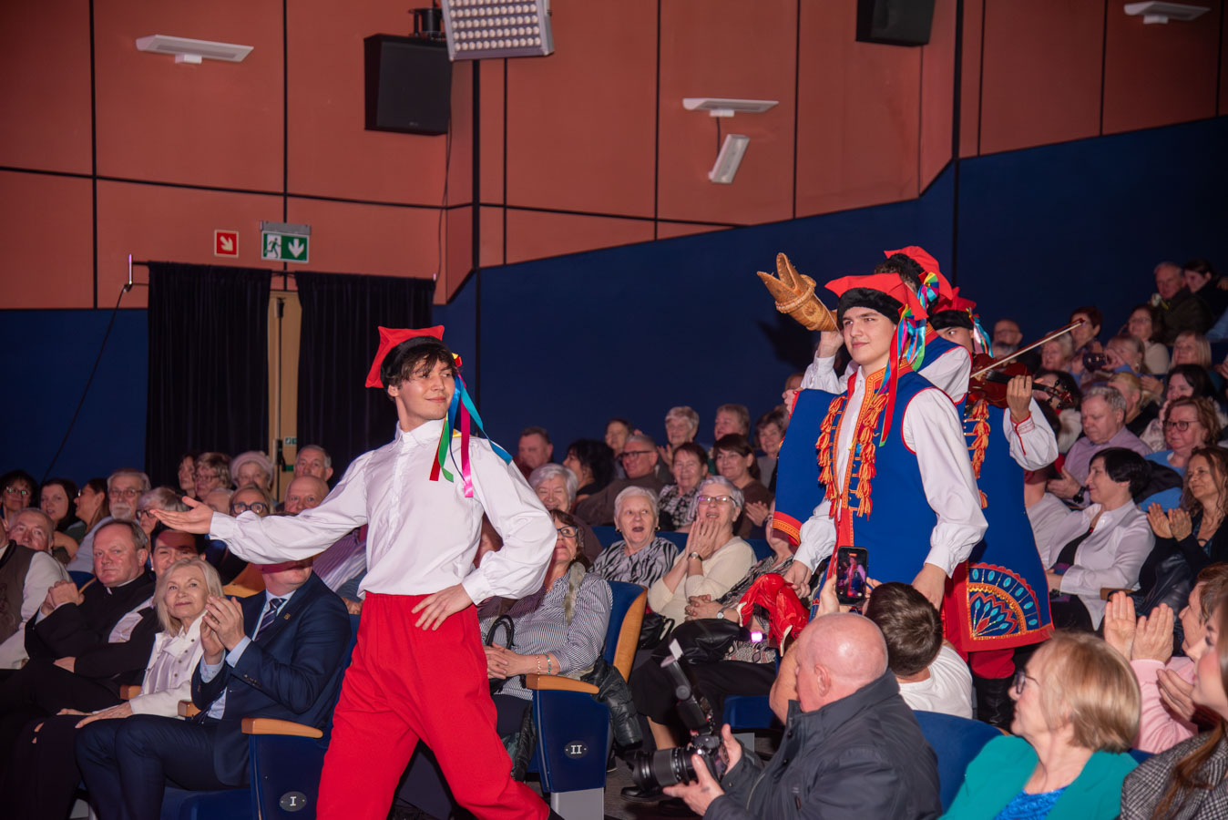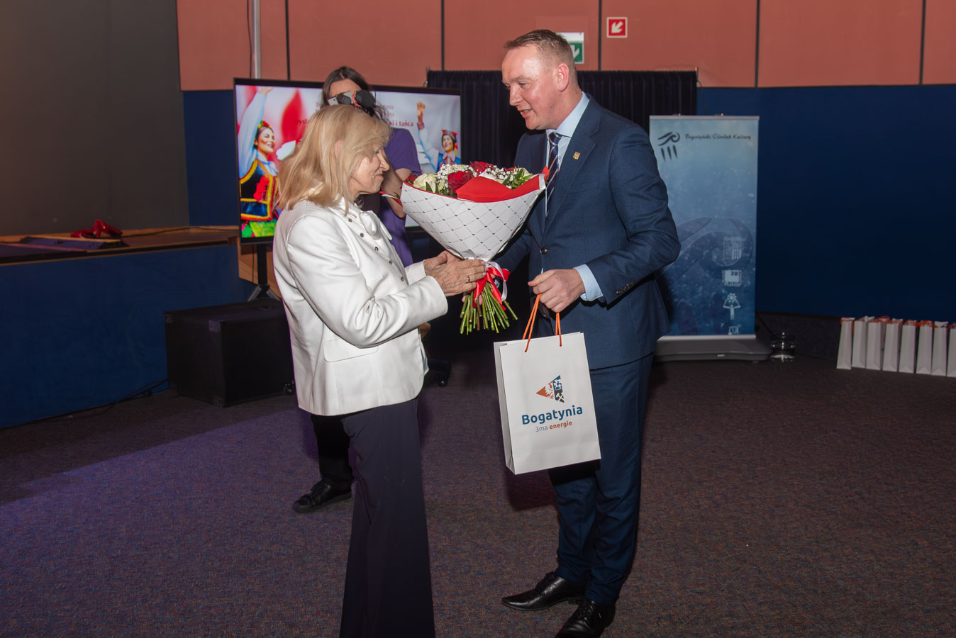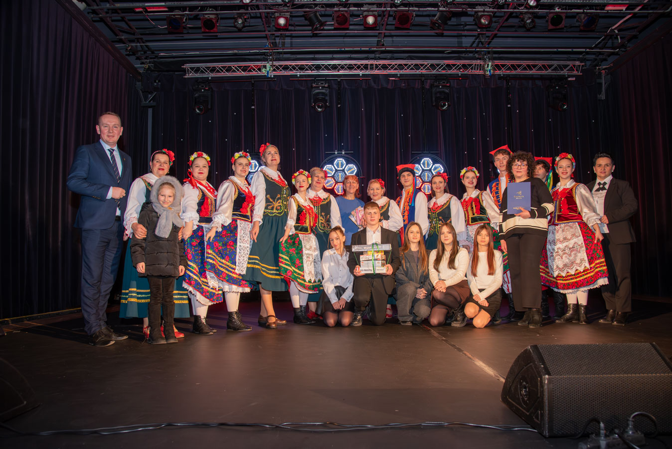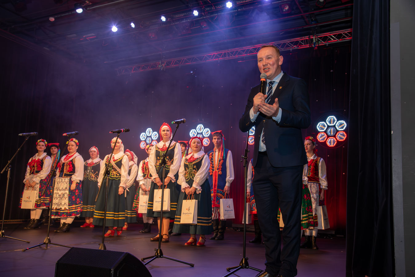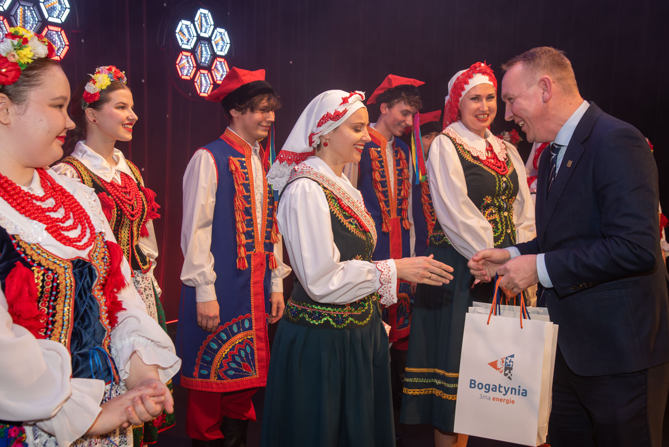 Koncert zespołów artystycznych „Narcyz” i „Syreny” z Pawłodaru w Kazachstanie otworzył burmistrz Wojciech Dobrołowicz, który zwrócił uwagę na symboliczny wymiar wydarzenia – obecność artystów, którzy pokonali ponad cztery tysiące kilometrów, by zaprezentować polską kulturę i język przed publicznością w Polsce. Podkreślił, że polska tożsamość nie ogranicza się do granic państwa, a „polskie serce bije na całym świecie”, również w Kazachstanie, gdzie od pokoleń żyją potomkowie deportowanych Polaków. Koncertowi towarzyszyły trzy projekcje filmowe przybliżające życie, historię i działalność Polonii w Pawłodarze. Zaprezentowano m.in. funkcjonowanie Szkoły Odrodzenia Narodowego im. Kanata Dorżumana, naukę języka polskiego, pielęgnowanie tradycji, działalność wolontariacką na rzecz miejsc pamięci oraz aktywność zespołów artystycznych „Narcyz” i „Syreny”, które od lat reprezentują Polaków z Kazachstanu w kraju i za granicą, m.in. podczas wystawy EXPO w Astanie. Filmy ukazały także współczesne oblicze Polonii jako wspólnoty międzypokoleniowej, aktywnej społecznie i kulturowo. W programie wydarzenia znalazł się również czas na podziękowania dla młodzieży oraz szkół z terenu gminy Bogatynia, zaangażowanych w akcję „Mogiły Pradziada Ocal od Zapomnienia”. Burmistrz podkreślił rolę wolontariatu młodego pokolenia, które aktywnie uczestniczy w zbiórkach darów oraz wyjazdach porządkowych na cmentarze kresowe. Prezes Fundacji Studio Wschód Grażyna Orłowska-Sondej zaznaczyła, że w skali Dolnego Śląska w akcję włączyło się tysiące uczniów i studentów, a w rekordowych latach ratowano dziesiątki nekropolii na terenach dawnej Rzeczypospolitej. Ks. Łukasz Chłopek, posługujący w Pawłodarze, przybliżył dramatyczną historię deportacji Polaków do Kazachstanu rozpoczętych w 1936 roku. Wskazywał na doświadczenie wieloletniej obcości zarówno na zesłaniu, jak i po ewentualnym powrocie do Polski oraz na rolę pamięci, wiary i kultury w zachowaniu tożsamości narodowej. Podkreślił znaczenie solidarności z Polakami żyjącymi poza granicami kraju oraz potrzebę nieustannego podtrzymywania więzi. Po blisko dwugodzinnym koncercie publiczność nagrodziła artystów owacjami na stojąco. Wydarzenie charakteryzowało się wysokim poziomem artystycznym występów, dopracowaną choreografią, muzykalnością wykonawców oraz autentycznymi emocjami towarzyszącymi prezentowanym utworom. Podczas podziękowań burmistrz zwrócił również uwagę na działalność Fundacji Studio Wschód oraz znaczenie programu „Wschód”, emitowanego w Telewizji Polonia i poświęconego tematyce kresowej. Po koncercie prowadzona była zbiórka podpisów pod petycją w obronie programu, wskazując na jego rolę w dokumentowaniu losów Polaków na Wschodzie oraz integrowaniu Polonii na całym świecie.