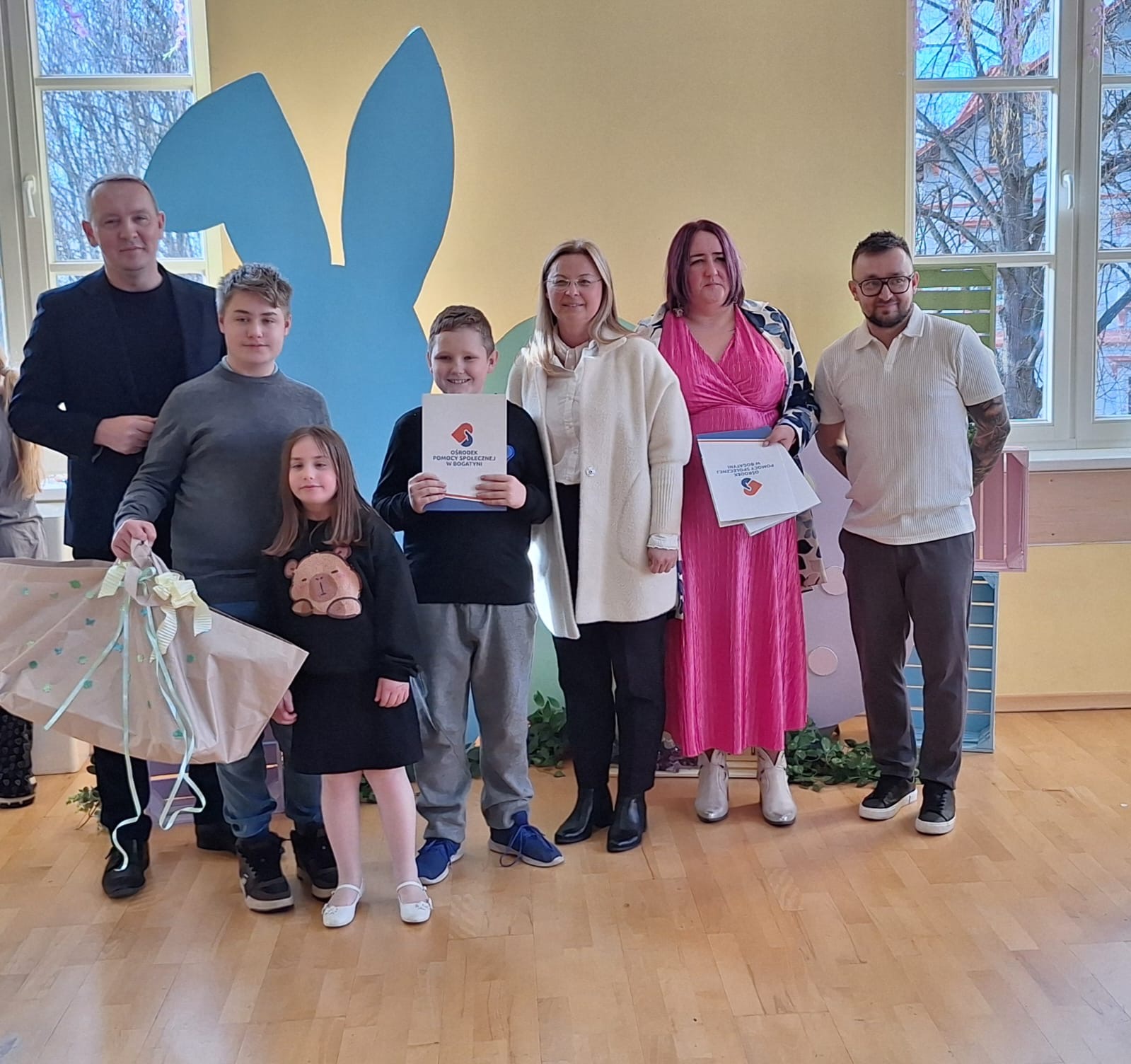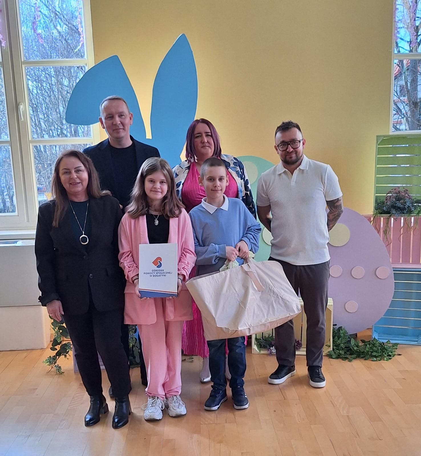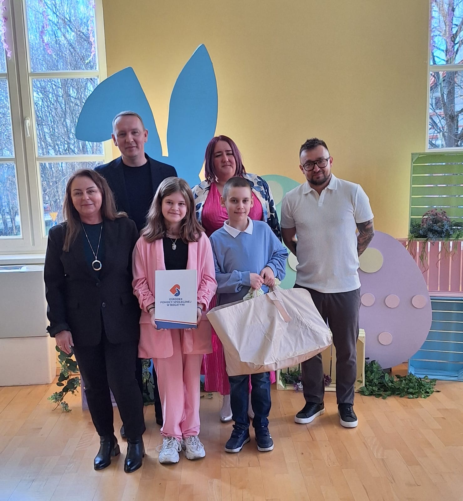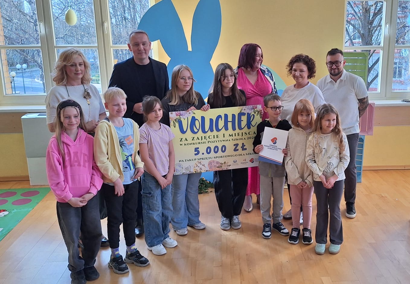 Jak już nakazuje wieloletnia tradycja na dolnym holu odbywał się kiermasz naszych lokalnych wystawców. Można było nabyć ozdoby świąteczne, stroiki, jajeczka, bransoletki, obrazy, robione na szydełku zajączki i kurczaczki, naturalne kosmetyki, pachnidła i pyszne ciasta. W sobotę i w niedzielę o godzinie 14.00 odbyły się darmowe seanse bajek dla dzieci oraz ich opiekunów w kinie KADR 3D. Następnie na sali tanecznej odbywały się świąteczne animacje i zabawy dla dzieci prowadzone przez Instruktorów BOK, bogatyńską Klanzę oraz Wioskę Czarów i Magii ze Spytkowa. W sali 103 na górnym holu gminne Szkoły Podstawowe rywalizowały w Międzyszkolnym Konkursie „Pozytywna Szkoła” – edycja 2026 - Konkurs na najpiękniejszą kartkę wielkanocną. Ostatecznie w wyniku weekendowego głosowania zwyciężyła kartka ze Szkoły Podstawowej nr 3 im. Kornela Makuszyńskiego w Bogatyni. Na zakończenie Kiermaszu i Warsztatów Wielkanocnych Burmistrz Miasta i Gminy Bogatynia Wojciech Dobrołowicz razem z Dyrektorem Ośrodka Pomocy Społecznej w Bogatyni Ewą Witczak uroczyście wręczyli zwycięzcom główną nagrodę konkursu, czyli voucher o wartości 5 000 zł na zakup sprzętu sportowego. Dziękujemy serdecznie wszystkim którzy wzięli udział w naszych 3 dniowych działaniach. Kolejne warsztaty i kiermasz w grudniu!