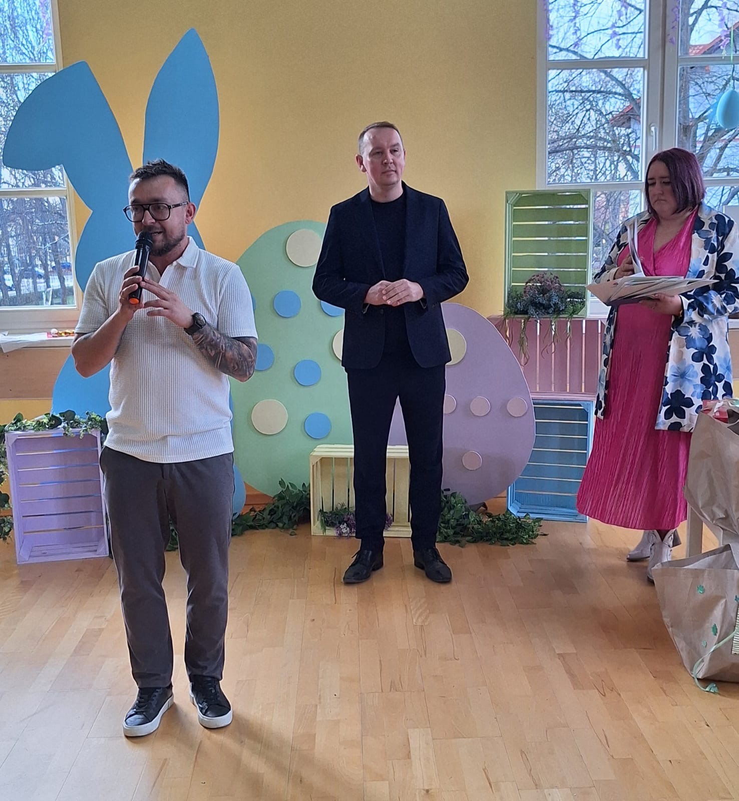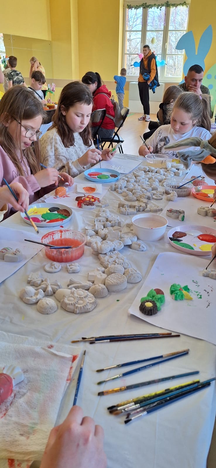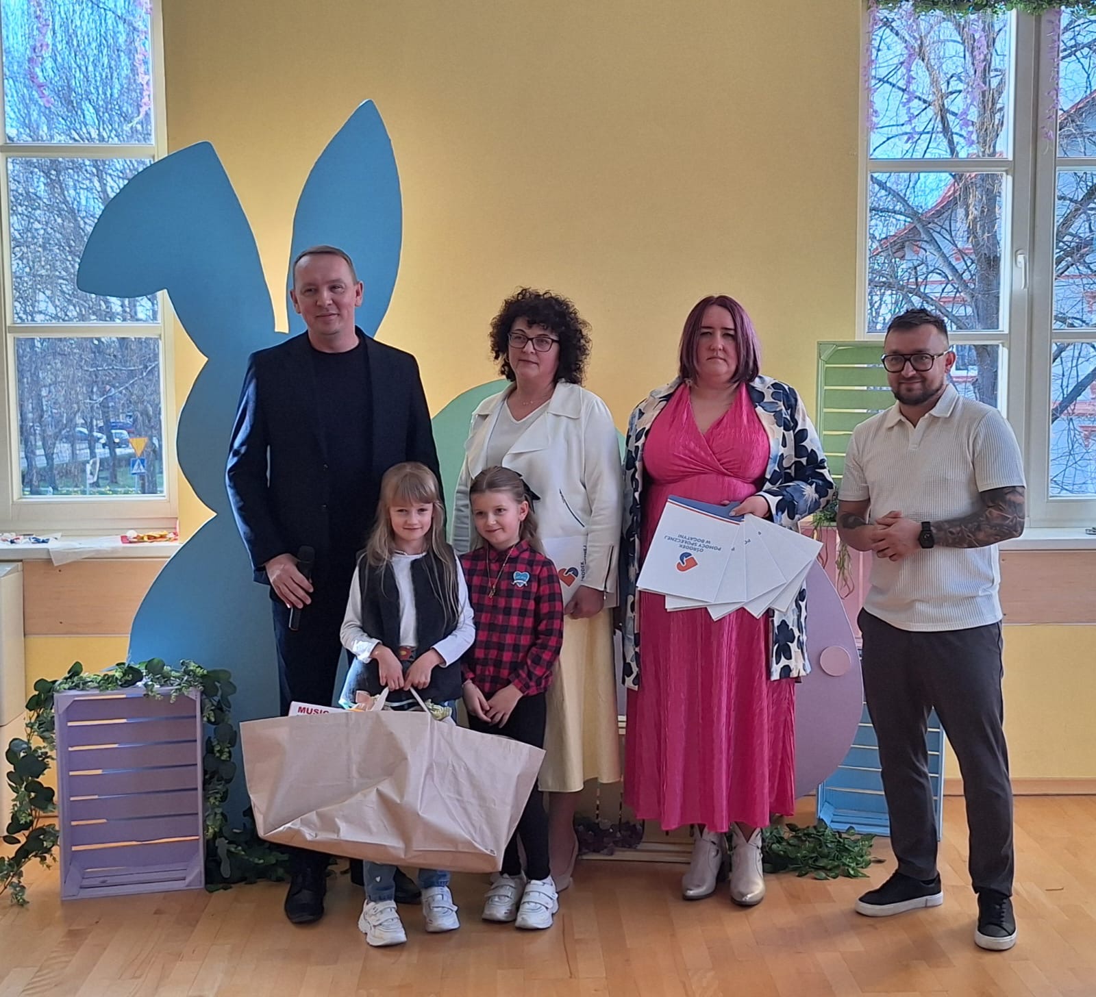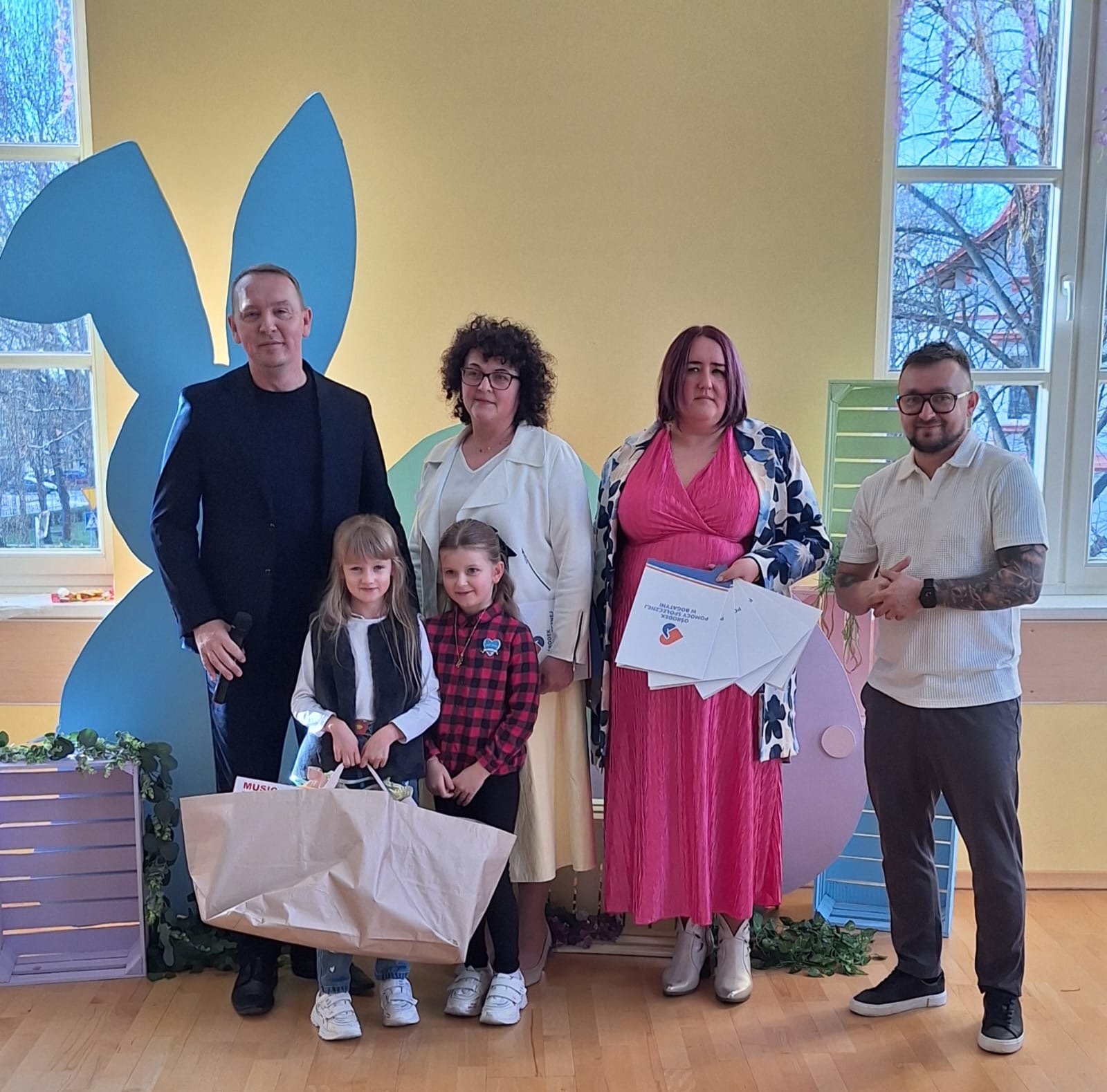 Jak już nakazuje wieloletnia tradycja na dolnym holu odbywał się kiermasz naszych lokalnych wystawców. Można było nabyć ozdoby świąteczne, stroiki, jajeczka, bransoletki, obrazy, robione na szydełku zajączki i kurczaczki, naturalne kosmetyki, pachnidła i pyszne ciasta. W sobotę i w niedzielę o godzinie 14.00 odbyły się darmowe seanse bajek dla dzieci oraz ich opiekunów w kinie KADR 3D. Następnie na sali tanecznej odbywały się świąteczne animacje i zabawy dla dzieci prowadzone przez Instruktorów BOK, bogatyńską Klanzę oraz Wioskę Czarów i Magii ze Spytkowa. W sali 103 na górnym holu gminne Szkoły Podstawowe rywalizowały w Międzyszkolnym Konkursie „Pozytywna Szkoła” – edycja 2026 - Konkurs na najpiękniejszą kartkę wielkanocną. Ostatecznie w wyniku weekendowego głosowania zwyciężyła kartka ze Szkoły Podstawowej nr 3 im. Kornela Makuszyńskiego w Bogatyni. Na zakończenie Kiermaszu i Warsztatów Wielkanocnych Burmistrz Miasta i Gminy Bogatynia Wojciech Dobrołowicz razem z Dyrektorem Ośrodka Pomocy Społecznej w Bogatyni Ewą Witczak uroczyście wręczyli zwycięzcom główną nagrodę konkursu, czyli voucher o wartości 5 000 zł na zakup sprzętu sportowego. Dziękujemy serdecznie wszystkim którzy wzięli udział w naszych 3 dniowych działaniach. Kolejne warsztaty i kiermasz w grudniu!