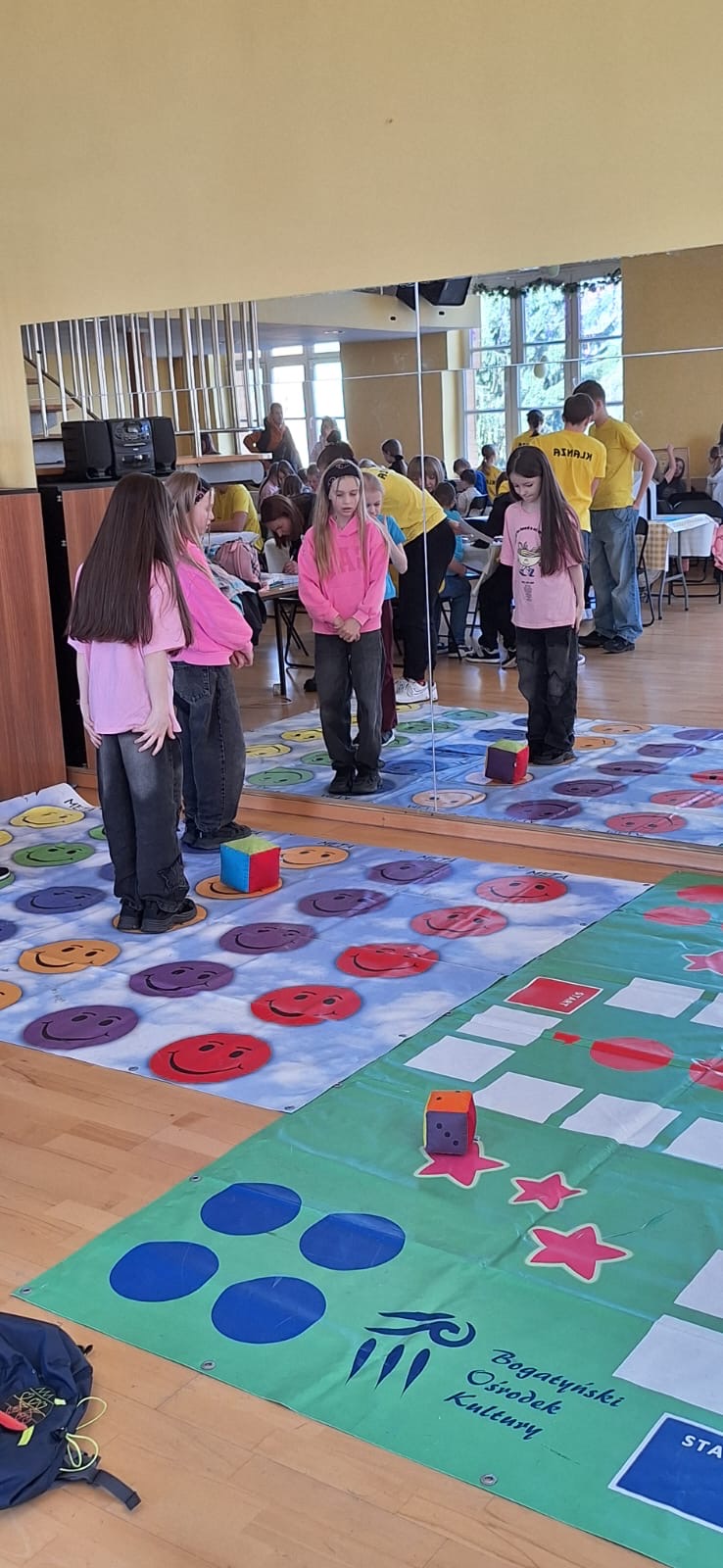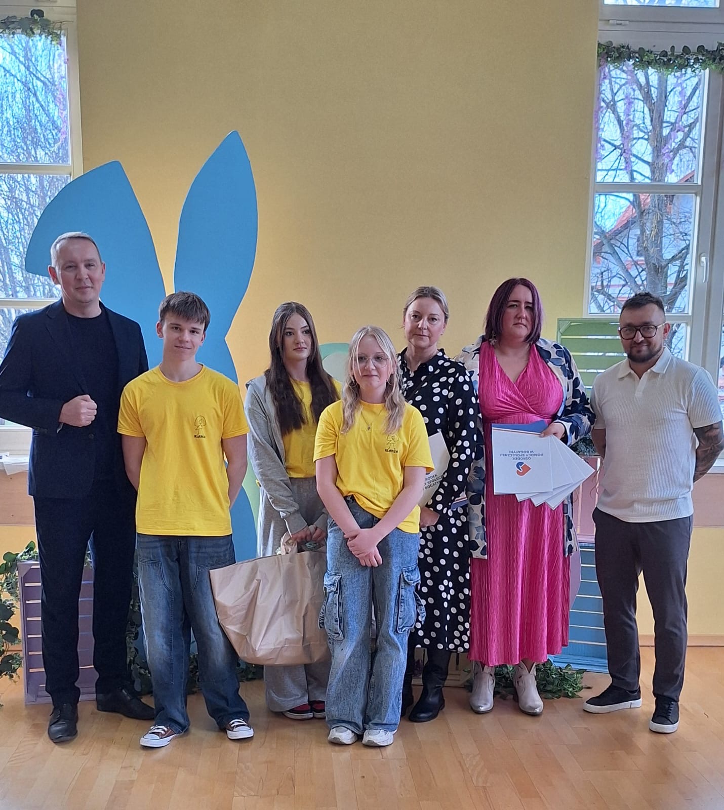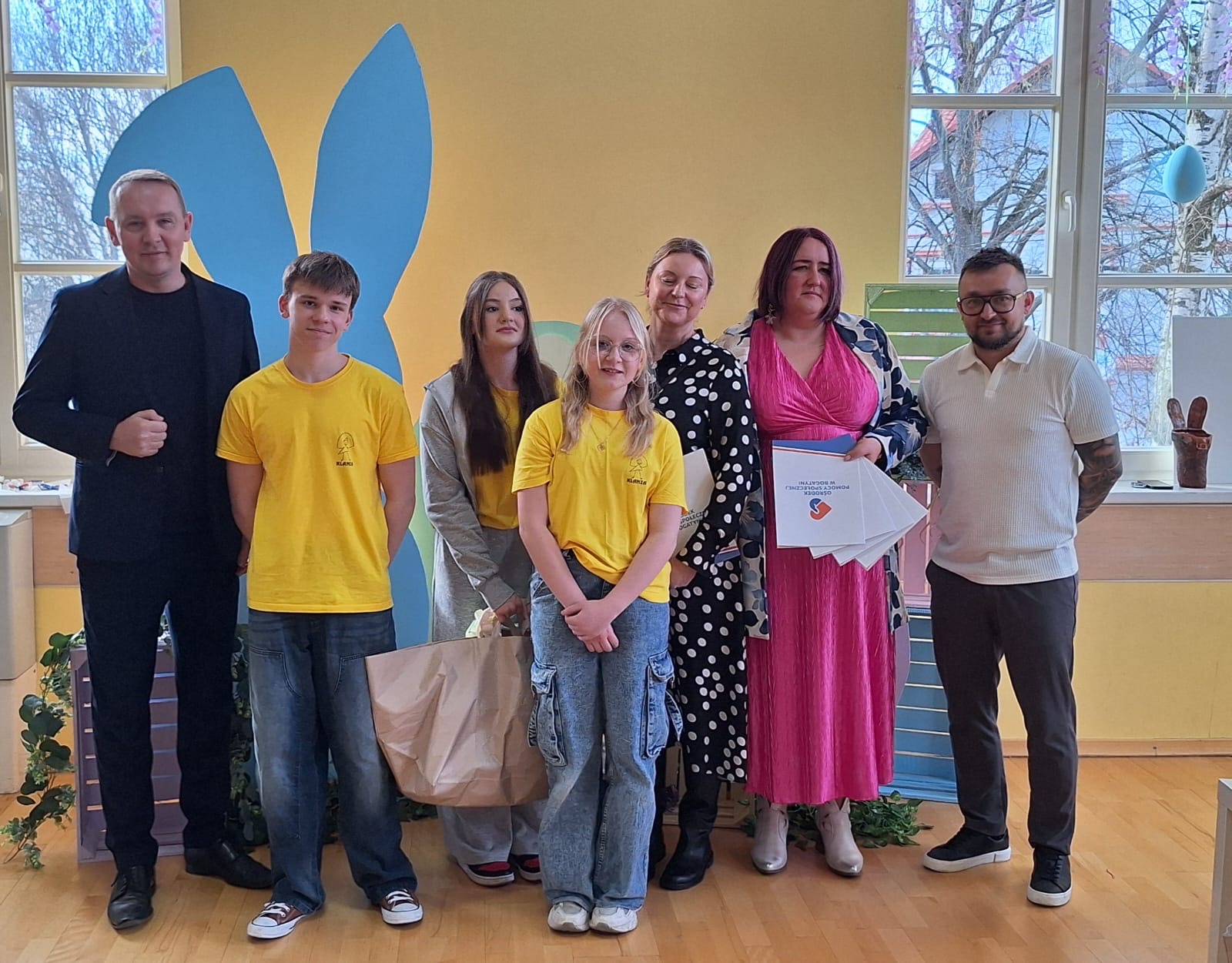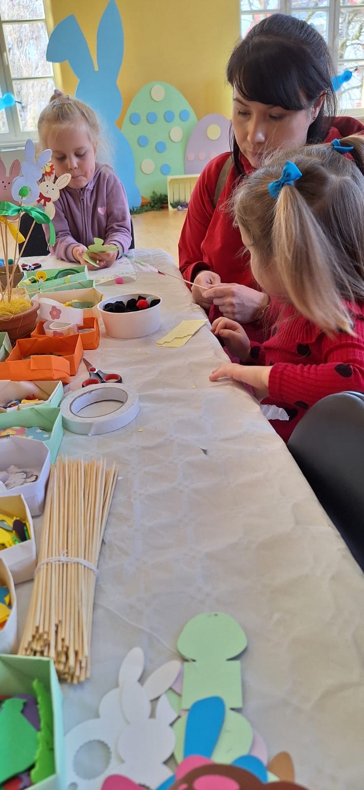 Jak już nakazuje wieloletnia tradycja na dolnym holu odbywał się kiermasz naszych lokalnych wystawców. Można było nabyć ozdoby świąteczne, stroiki, jajeczka, bransoletki, obrazy, robione na szydełku zajączki i kurczaczki, naturalne kosmetyki, pachnidła i pyszne ciasta. W sobotę i w niedzielę o godzinie 14.00 odbyły się darmowe seanse bajek dla dzieci oraz ich opiekunów w kinie KADR 3D. Następnie na sali tanecznej odbywały się świąteczne animacje i zabawy dla dzieci prowadzone przez Instruktorów BOK, bogatyńską Klanzę oraz Wioskę Czarów i Magii ze Spytkowa. W sali 103 na górnym holu gminne Szkoły Podstawowe rywalizowały w Międzyszkolnym Konkursie „Pozytywna Szkoła” – edycja 2026 - Konkurs na najpiękniejszą kartkę wielkanocną. Ostatecznie w wyniku weekendowego głosowania zwyciężyła kartka ze Szkoły Podstawowej nr 3 im. Kornela Makuszyńskiego w Bogatyni. Na zakończenie Kiermaszu i Warsztatów Wielkanocnych Burmistrz Miasta i Gminy Bogatynia Wojciech Dobrołowicz razem z Dyrektorem Ośrodka Pomocy Społecznej w Bogatyni Ewą Witczak uroczyście wręczyli zwycięzcom główną nagrodę konkursu, czyli voucher o wartości 5 000 zł na zakup sprzętu sportowego. Dziękujemy serdecznie wszystkim którzy wzięli udział w naszych 3 dniowych działaniach. Kolejne warsztaty i kiermasz w grudniu!