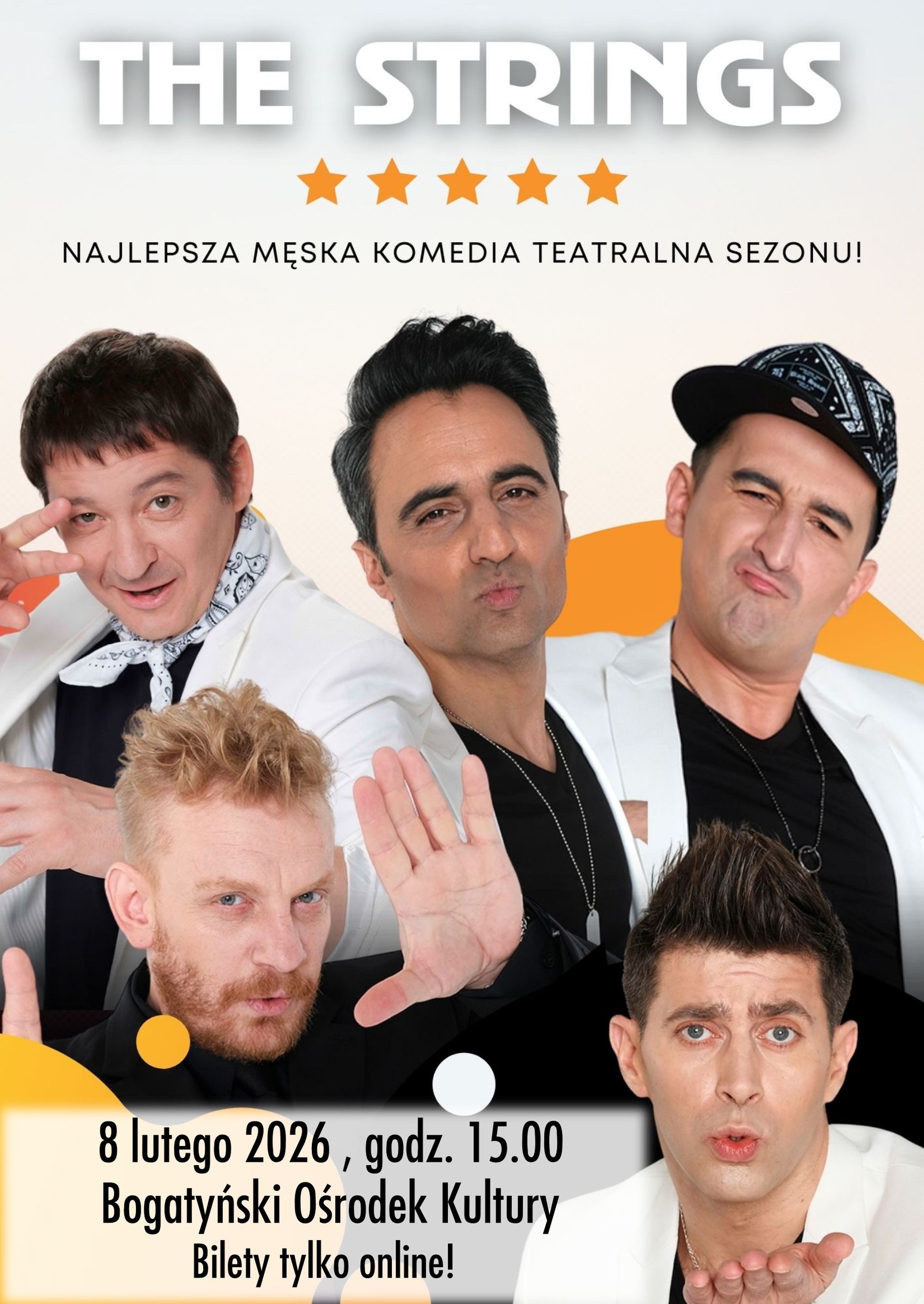 Niebanalne żarty, moc przyjaźni, grupa 5 mężczyzn, którzy spotkali się będąc na życiowym zakręcie. W tle muzyka, która osładza ich perypetie. To krótki opis spektaklu autorstwa i reżyserii Macieja Kowalewskiego. „The Strings – pełna humoru i zwrotów akcji sztuka, która po prostu przywraca wiarę w marzenia oraz siłę przyjaźni. Kim są nasi bohaterowie? To Ernest, Kotlet i Manuel. Ernest rozpacza, ponieważ żona wyrzuciła go z mieszkania i z życia. Kotlet za dużo pije, a na dodatek został zwolniony z zespołu chippendales, który sam założył. Manuel właśnie wyleciał z hukiem z legendarnego zespołu Figi, który dziś koncertuje w muszli. Załamani panowie na zakręcie życiowym postanawiają wziąć sprawy w swoje ręce i zakładają zespół The Strings. Kto do nich dołączy? Jak potoczą się ich losy? O tym przekonacie się będąc na widowni. Od pierwszych minut spektaklu, będą płynąć łzy ze śmiechu, by następnie przeszły w łzy wzruszenia. Nasi bohaterowie przez całą sztukę na oczach widza, będą zmieniać swoje podejście do życia, priorytety, a przyjaźń stanie się dla nich czymś najważniejszym.