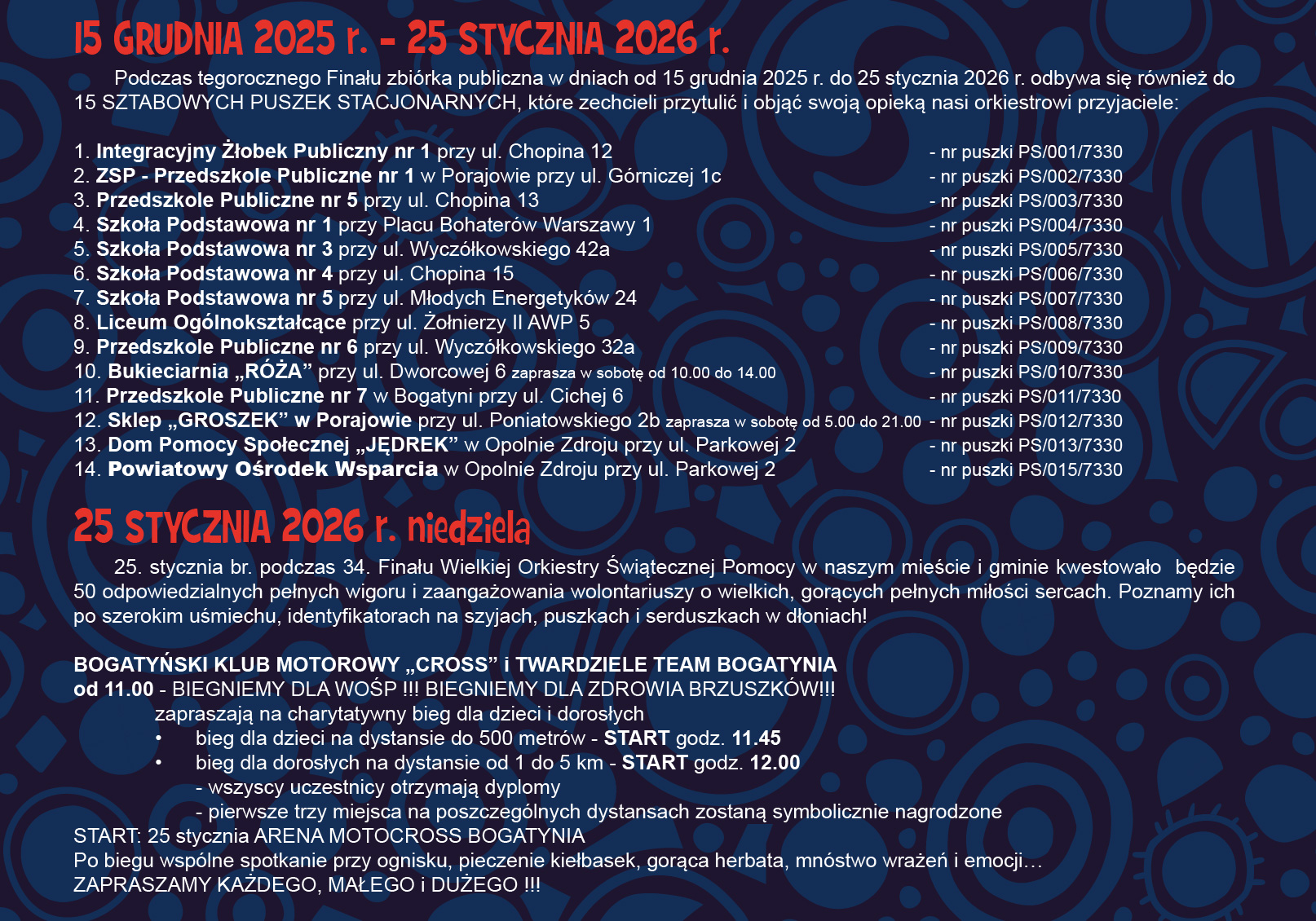 25 stycznia br. podczas 34. Finału Wielkiej Orkiestry Świątecznej Pomocy w naszym mieście i gminie kwestowało będzie 50 odpowiedzialnych pełnych wigoru i zaangażowania wolontariuszy o wielkich, gorących pełnych miłości sercach. Poznamy ich po szerokim uśmiechu, identyfikatorach na szyjach, puszkach i serduszkach w dłoniach!