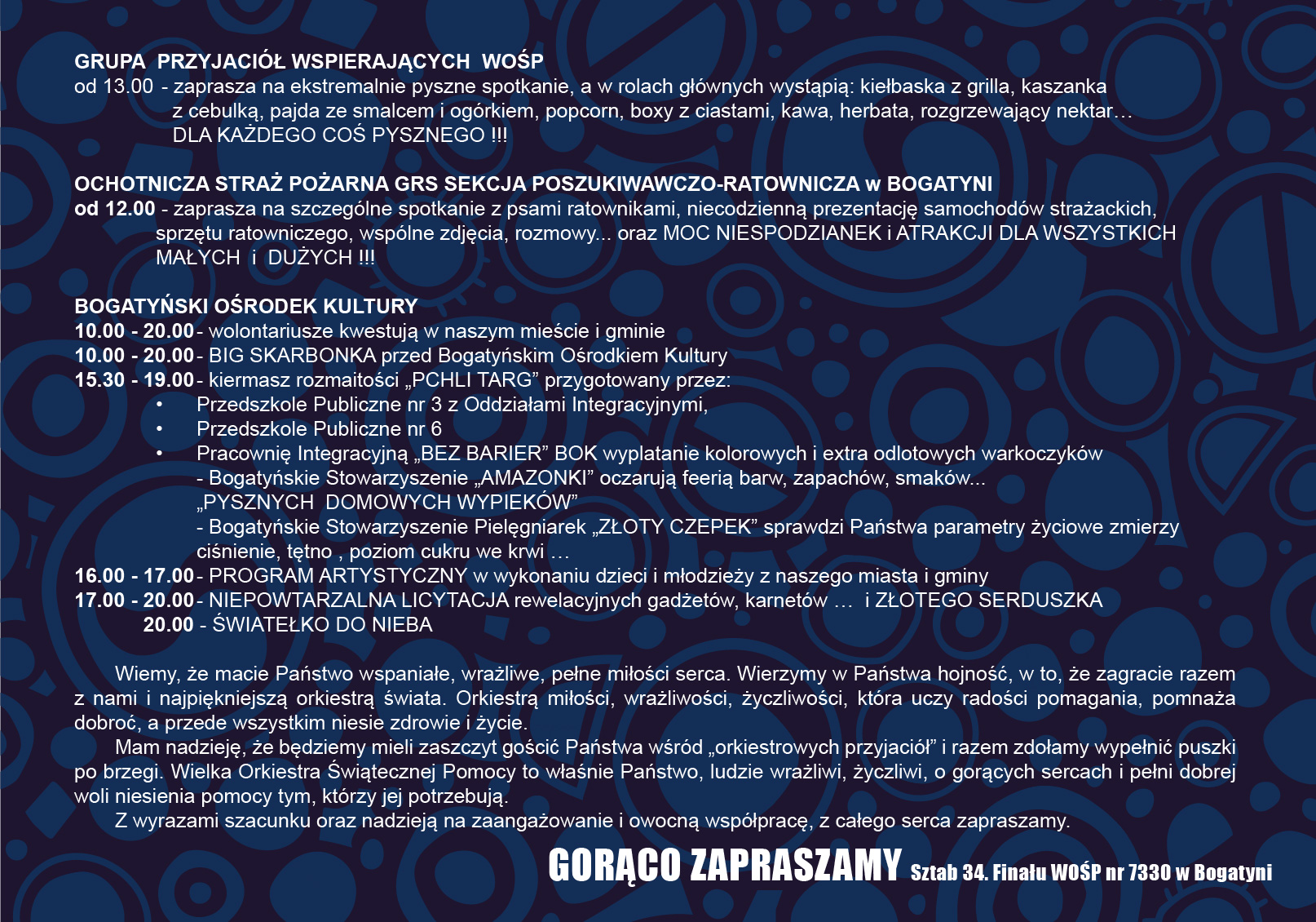 PROGRAM SZTABU 34. Finału WOŚP nr 7330 w BOGATYNI utworzonego przy Bogatyńskim Ośrodku Kultury.