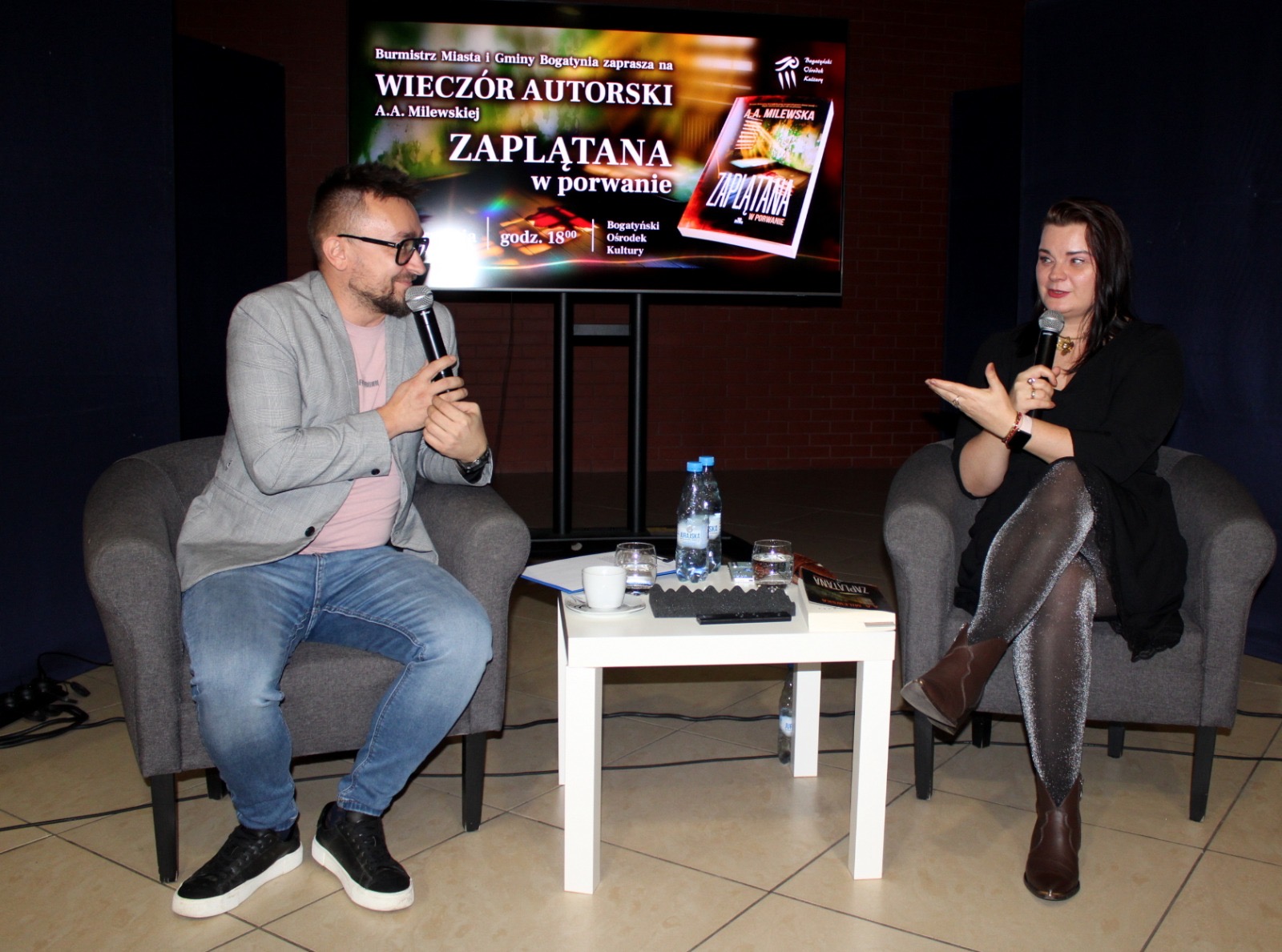 Autorka powraca z kolejną częścią cyklu „Zaplątana”. Po „Zaplątanej w morderstwo” przyszedł czas na „Zaplątaną w porwanie”. Spotkanie poprowadził dyrektor BOK Marcin Woroniecki. Po rozmowie i pytaniach prowadzącego głos zabrała zgromadzona w Kopalni Dźwięków publiczność pytając o książkę, procesy twórcze oraz plany na przyszłość. Na spotkaniu obecny był Burmistrz Wojciech Dobrołowicz. Autorce życzymy wydania kolejnych zaplanowanych już książek a zgromadzonym dziękujemy za obecność i zapraszamy na kolejne spotkania autorskie do Bogatyńskiego Ośrodka Kultury.